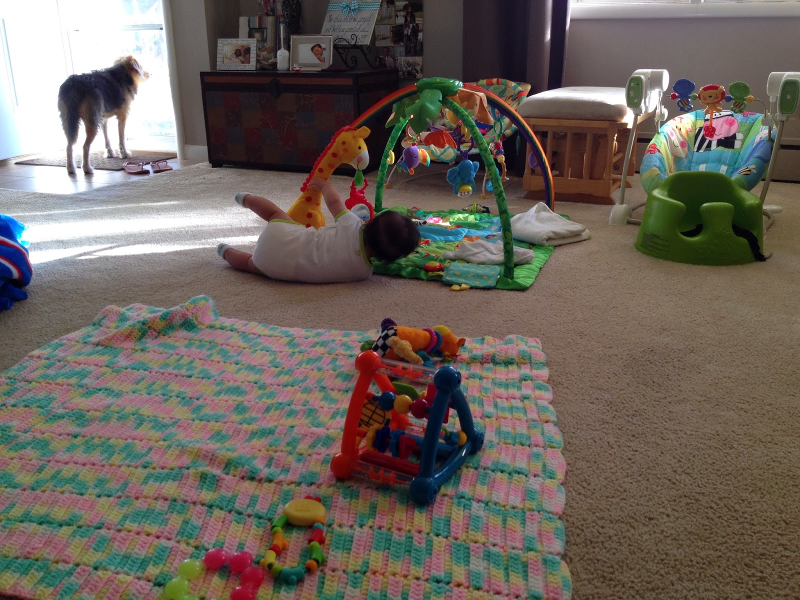 Lux knows how to travel from point A to point B now, from scooting around on her tummy and rolling from place to place. She is extremely mobile and is never where you put her down-she's always on the move - usually after a toy or Alexio's stuff.
